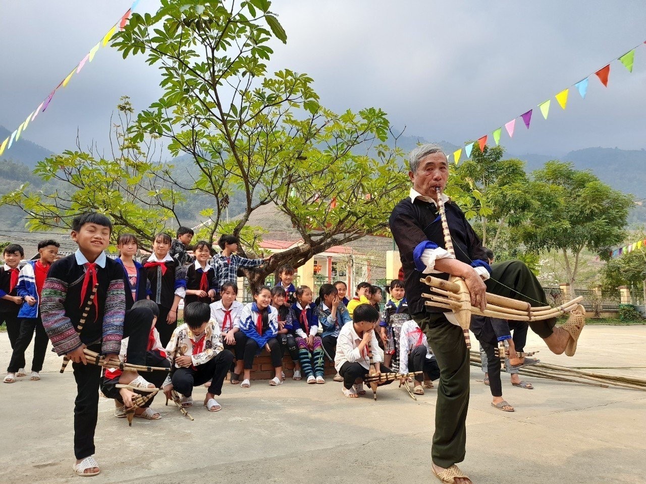 在老街省高原地区的学校中,唢呐、Xoe舞、天琴等传统文化元素早已不再只是节庆上的遥远回响,而是融入了校园的日常生活——响起于升旗仪式间,穿梭在操场上,弥漫于图书馆中。文化遗产成为每日的呼吸——孩子们可以穿上它、弹奏它、刺绣它、讲述它,让每一节课不仅传授知识,也守护乡土灵魂。
